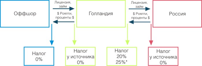 *Схема работает при условии, что офшорная компания c Нидерландских Антильских Островах учреждает фирму непоредственно в Нидерландах, с общей долей участия более 25%, а та в свою очередь выступает учредителем российской компании на аналогичную долю или более.