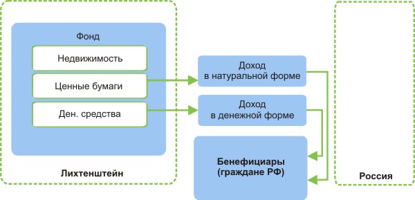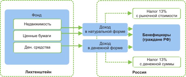 Если бенефициары Фонда ― граждане РФ, то каждый факт получения бенефициаром из Фонда доходов (денежных средств, ценных бумаг, недвижимости и др.) будет рассматриваться российскими налоговыми органами как факт получения дохода от источников за пределами РФ.